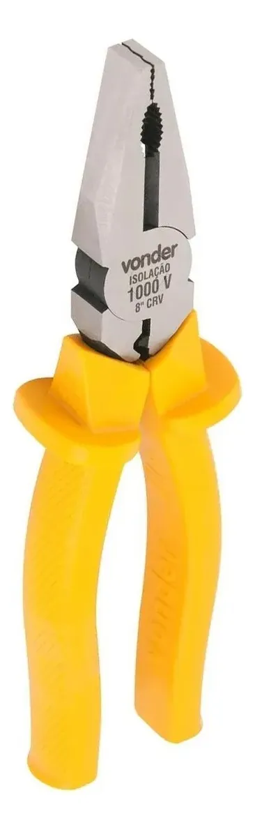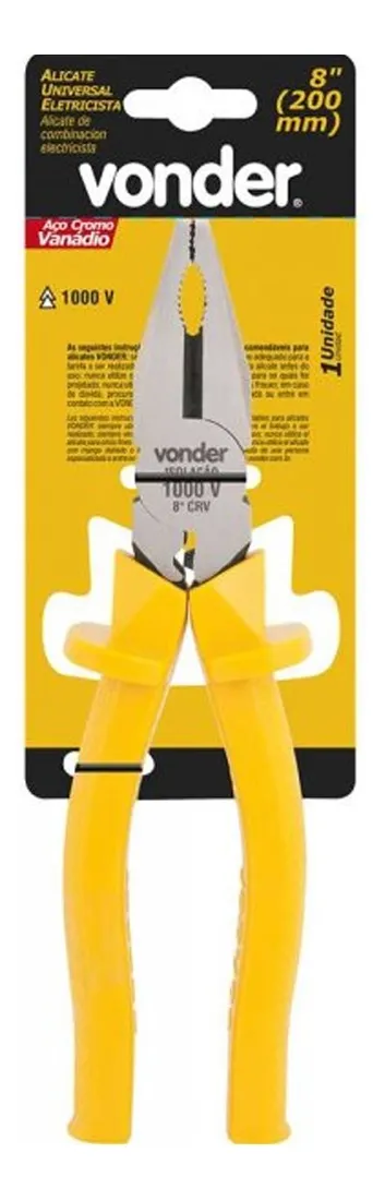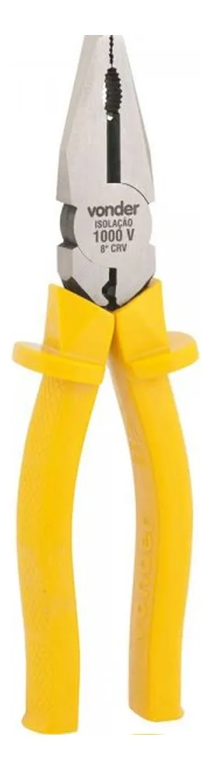 Alicate Universal Vonder Profissional de 8 polegadas, com isolamento para até 1.000V. Produzido em aço cromo vanádio de alta resistência, possui cabo ergonômico emborrachado e antiderrapante para maior segurança e conforto. Ideal para eletricistas, oferece máxima precisão em cortes e manuseio de cabos e componentes elétricos.