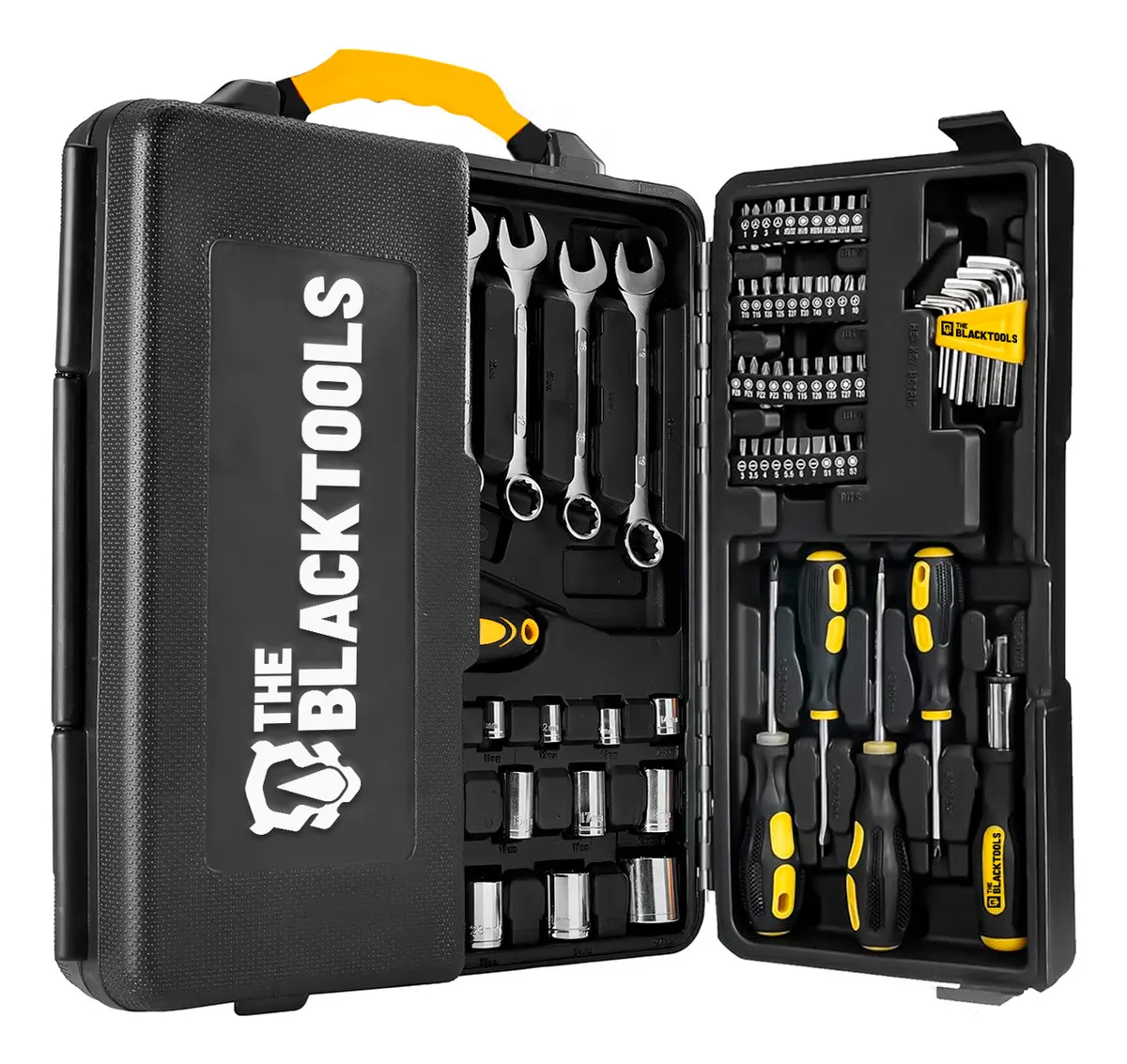 Jogo de ferramentas profissional The Black Tools TTK110 com 110 peças em aço cromo-vanádio. Inclui chaves catraca, soquetes, chaves combinadas, alicates e bits variados. Ideal para mecânicos e manutenções em geral, acompanhado de maleta compacta e resistente para organização e transporte seguro.