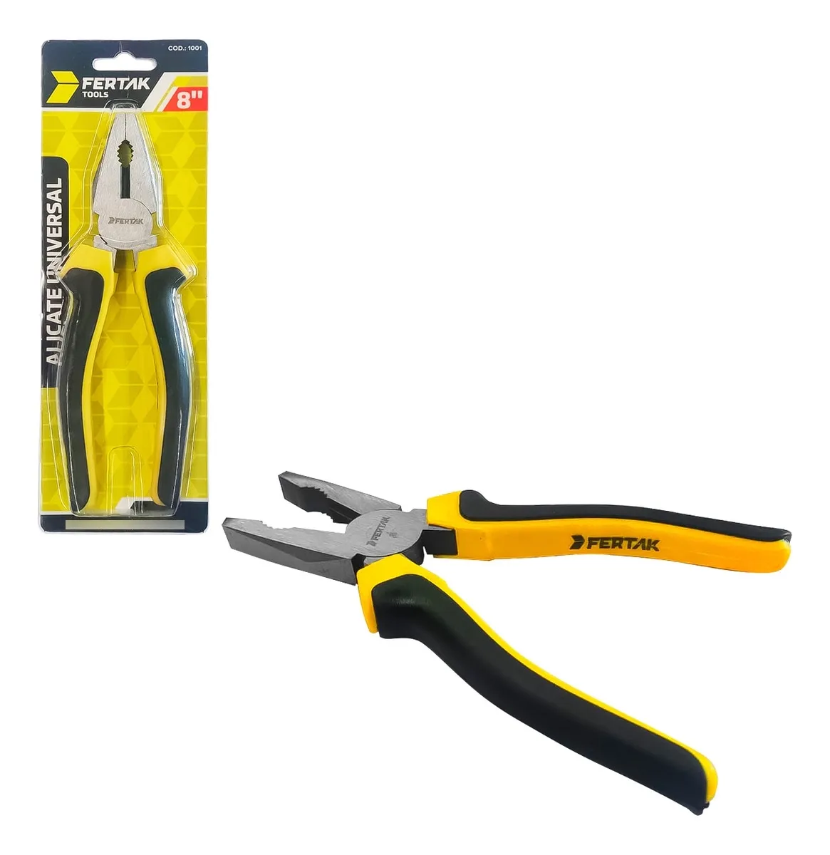 Kit de 3 alicates Fertak contendo: 1 Alicate Universal 8″, 1 Alicate de Bico Meia Cana 6″ e 1 Alicate de Corte Diagonal 6″. Produzidos em aço carbono com acabamento polido para resistência à corrosão e cabos anatômicos antideslizantes. Ideal para reparos domésticos e profissionais que exigem precisão e conforto no manuseio.