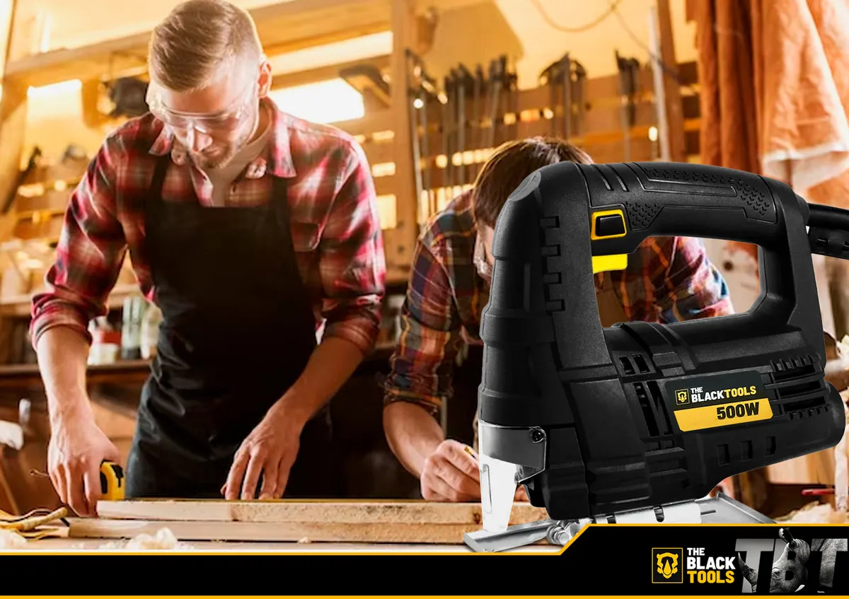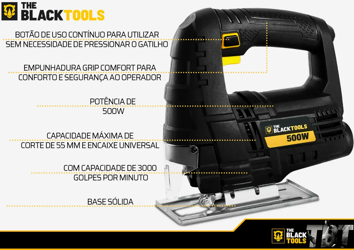 Serra Tico-Tico The Black Tools BST500 de 500W com 3.000 GPM. Ideal para cortes precisos em madeira, metal e alumínio, com base ajustável para ângulos de até 45º. Ferramenta leve, ergonômica e com botão de trava para uso contínuo, garantindo praticidade e segurança em seus projetos de marcenaria ou reparos domésticos.